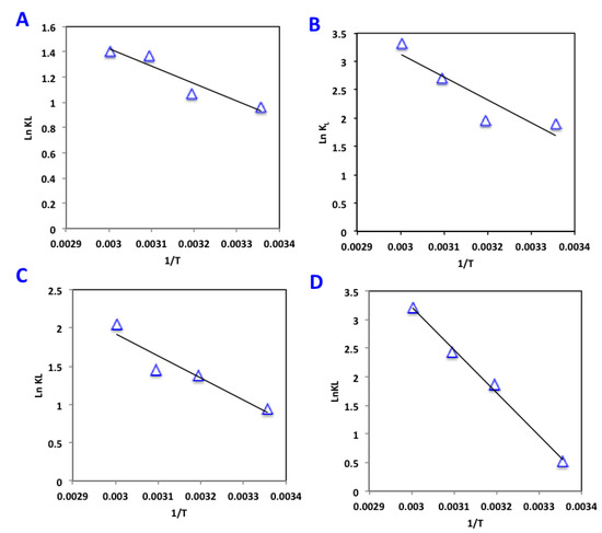 The Van’t Hoff equation was used to investigate the values of enthalpy (ΔH) and entropy (ΔS) as given in Equation (9). Since, the equilibrium constant (KL) can be used to investigate the thermodynamic variables, the change in Gibbs free energy of the sorption is attained by Equation (10) [25].