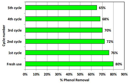After treatment, the adsorbent material was washed out for reuse in order to investigate its cyclic performance and treatment efficiency. In this regard, recovered alum sludge adsorbent material was collected after treatment and subjected for successive distilled water washing for regeneration facility. Then, the resultant material was oven dried (for 1 h at 105 °C) to be ready for use in successive treatment. The outcome of this work is illustrated in Figure 10. As displayed in Figure 10, the alum sludge material showed a good reusability potential since its removal efficiency reached 65% removal after the fifth cycle use, compared to 80% removal for the fresh use. Furthermore, the aluminum release in water is measured in the treated water; only 0.003 g L−1 of aluminum is monitored after treatment in the wastewater according to use of 2 g L−1 of alum sludge material. These results confirm the AS stability and its adsorption activity even after several uses. These data suggest such material to be a suitable candidate for real industrial applications. However, further research could be conducted for industrial large-scale application. In this context, appropriate material characteristics must be optimized for design aspects. Thus, upgrading such a procedure could highlight a new opportunity for a sustainable world in the modern era.