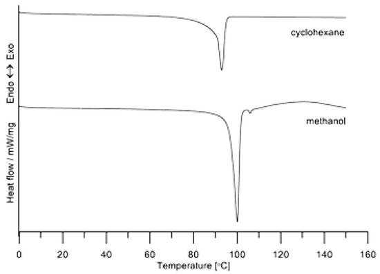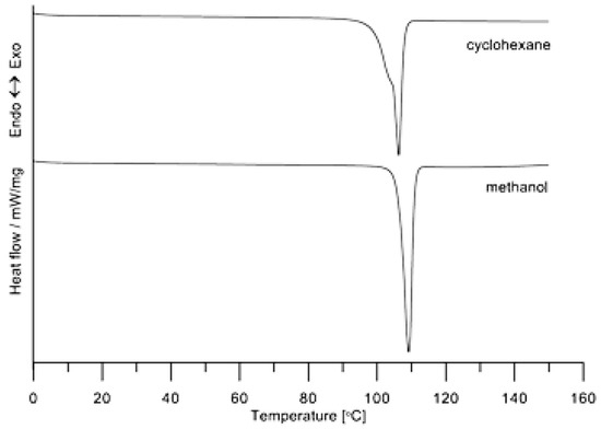 An interesting fact observed for these compounds is the existence of two melting points, depending on the solvent used for crystallisation viz. methanol or cyclohexane. The sample of MGlc obtained by the crystallisation from methanol melts at 100.0 °C, while recrystallisation from cyclohexane determines the product of the melting point at 92.9 °C (Figure 1). Similar behaviour was observed for solid AGlc; the melting point was at 109.2 °C for the sample crystallised from methanol, while after recrystallisation from cyclohexane, it was 106.3 °C (Figure 2). Interestingly, independent of the solvent used, recrystallisation of AGlc via slow solvent evaporation resulted in the growth of very thin needle-like crystals of a similar size and morphology (Figure 3).