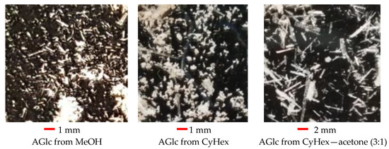 Crystal morphology observed for AGlc crystallised from the solvents: methanol, cyclohexane, and the mixture of cyclohexane–acetone (v:v; 3:1).