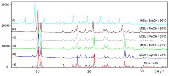 Powder X-ray diffraction patterns of the samples of MGlc crystallised from cyclohexane (b) and from methanol (c–f), were recorded at 25, 55, 80, and 95 °C. The reference pattern of MGlc (a) calculated from single-crystal data is given in red.