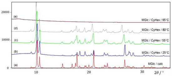 A great similarity was found for MGlc between the appropriate powder patterns recorded at 55 and 80 °C (Figure 4d,e and Figure 5b–d). However, at higher temperatures, the thermal behaviour of the batches was completely different. After heating the samples to 95 °C the MGlc (from CyHex) was completely melted (Figure 5e) whereas the sample MGlc (from MeOH) underwent the phase transition as confirmed by the shift and appearance/disappearance of many diffraction peaks characteristic of MGlc (Figure 4f). Absorption of undetectable amounts of solvent between the blocks of MGlc crystallites is possible, which affects the thermal stability of the entire phase. Thus, comparing the above diffraction data with the results of the DSC analysis performed in the dynamic atmosphere of argon (Figure 1), it can be concluded that for MGlc (from MeOH) the melt-recrystallization phase transition occurs prior to the final melting.