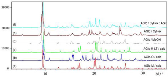 Powder X-ray diffraction patterns of AGlc recrystallised from methanol (d), cyclohexane (e), and the cyclohexane–acetone (3:1) mixture (f). The reference patterns of polymorphic forms AGlc-M, AGlc-O, and AGlc-M-LT (calculated from data from the X-ray structure analysis) are given in red, dark blue, and green, respectively (a–c).