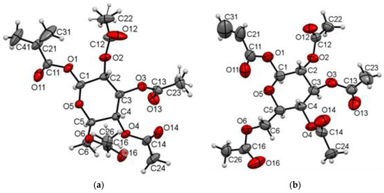 As follows from the structural data, the molecules of both compounds exist as the β-anomers in a solid state (Figure 7). In all structures, the pyranose ring has a slightly distorted (4C1) chair conformation. The equatorial position of the meth/acryl group is confirmed by the O1–C1–O5–C5 torsion angle, which is approximately 180° (±8°). The orientation of the acetoxy groups at the ring positions C2, C3 and C4 as well as the substituent at C5 are also equatorial (Table S1).