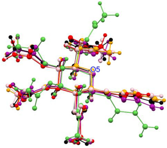 The overlay of the AGlc conformers present in the asymmetric part of the unit cell in the crystals: AGlc-M (black line), AGlc-O (molecule A—green line and B—violet line), and AGlc-M-LT (molecule A—pink line, B—red line, and C—orange line).