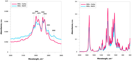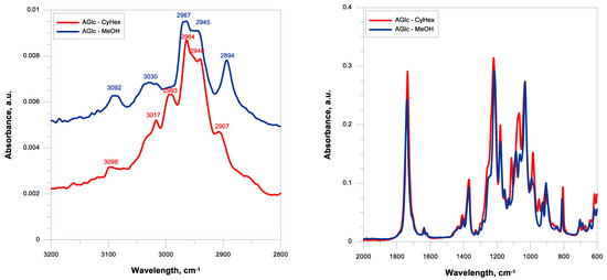 In the wavenumber range from 2900 to 3200 cm−1, differences between the spectra for AGlc and MGlc are also observed. For MGlc, the spectra of the samples crystallised from methanol and cyclohexane show no differences (Figure 9). One can see the bands with high intensity at 2933, 2946, 2979, and 2998 cm−1 and three low-intensity bands at 2858, 2905, and 3017 cm−1.