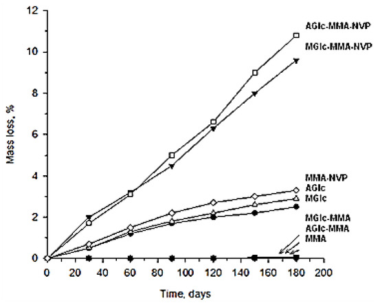 Soil tests indicate that the homopolymers of both MGlc and AGlc are biodegradable. Their weight loss after 180 days of the sample presence in soil is in the range of 2.5–2.9% (Figure 11). The introduction of MGlc and AGlc into the structure of the MMA copolymer initiated its degradation. The weight loss for MGlc-MMA and AGlc-MMA was 0.02 and 0.06%, respectively, while PMMA alone is not biodegradable at all. The addition of the hydrophilic monomer NVP caused a significant acceleration of degradation. After 180 days, the weight loss of the copolymers MGlc-MMA-NVP and AGlc-MMA-NVP was about 10%. This means that the addition of MGlc or AGlc monomers can cause the biodegradation of absolutely non-biodegradable polymers such as PMMA.