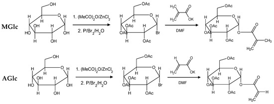 The paper presents new monomeric derivatives of glucose meth/acrylate (MGlc and AGlc). It turned out that in the preparation of meth/acrylate glucose derivatives, direct esterification with acids, which we used many times, was ineffective or even impossible [31,32,33]. The most effective was the procedure based on 1-bromo-2,3,4,6-tetra- O-acetyl-D-glucopyranose and further reaction of the bromo-derivative of glucose obtained in this way with a salt of acrylic or methacrylic acid. The recipe described by Vogel was used for the synthesis of 1-bromo-2,3,4,6-tetra-O-acetyl-D-glucopyranose and the product was obtained in good yield (~90%).