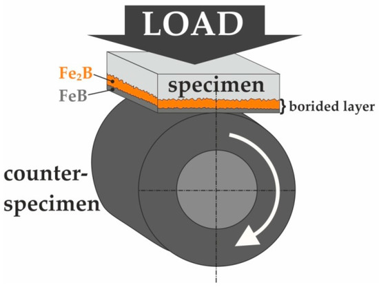 The wear resistance tests were performed under the conditions of unlubricated dry friction. The friction pair consisted of an immobile specimen (in the shape of a plate) and a mobile counter-specimen (in a shape of a ring with an external diameter of 20 mm, internal diameter of 12 mm, and height of 12 mm). The counter-specimen was made of quenched and low-tempered 100CrMnSi6-4 bearing steel with a hardness of 64 HRC. The following parameters were used during the tests: load of 5 kgf (49 N), counter-specimen rotation speed (n) of 250 min−1, duration of 4 h. The scheme for the wear resistance test with the positions of the specimen and counter-specimen is shown in Figure 2. The initial contact area between the specimen and counter-specimen was linear. As the wear time progressed, a friction path was formed in the tested sample. The shape of this friction path represented the shape of the outer cylindrical surface of the counter-specimen with a radius of approximately 10 mm. Therefore, the contact pressure changed during the wear test and was difficult to determine. The tribological properties were investigated for two specimens: non-borided X165CrV12 steel and X165CrV12 steel borided at 1223 K for 9 h. Although the total duration of the test was 4 h, the masses of the specimen and counter-specimen were measured every 30 min of the test. Based on the obtained results, three parameters describing the wear resistance were determined: the mass wear intensity factor (Imw) of the specimens and counter-specimens, the ratio of mass loss to the length of the wear path (∆m/l) for the specimens, and the relative mass loss (Δm/mi) for the counter-specimens.