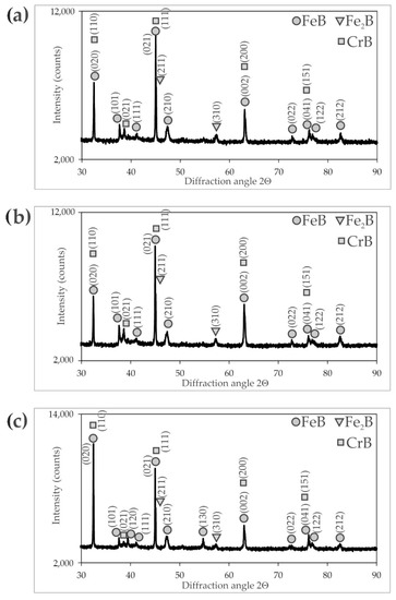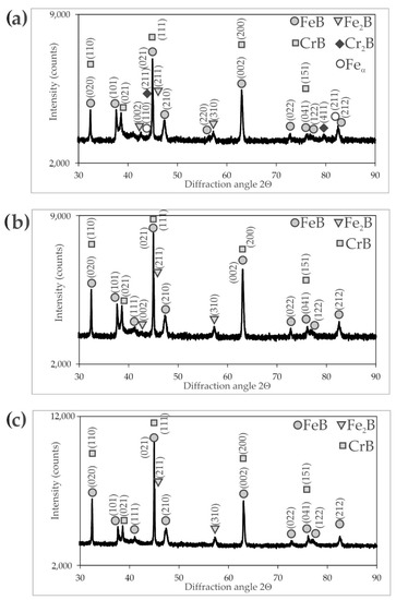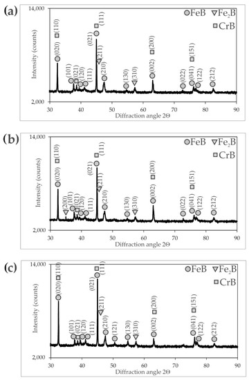 Boriding is a thermochemical treatment that is well-known as an effective technique to improve the hardness and wear resistance of non-ferrous as well as ferrous alloys, including different types of steels. The parameters of the process (temperature and time) play key roles in constituting the chemical and phase composition as well as the properties of the steel after boriding. The chemical composition of the treated steel is the second factor influencing the microstructure and properties of the borided layers. In the case of pure iron [1,2,3,4], as well as low-carbon and low-alloy steels [5,6,7], the produced borided layers are characterized by strong zonation and a needle-like microstructure. Depending on the boriding method and its parameters, the microstructure of such layers can be single-phase, containing only Fe2B borides [3,7] or can be composed of two types of iron borides (FeB + Fe2B) as a dual-phase layer [1,2,4]. In general, a higher temperature and longer duration of the boriding process results in an increase in the borided layer thickness. The phase composition of the boride layer influences the mechanical properties, e.g., the boron-rich FeB phase is significantly harder than the Fe2B phase [4]. The various types of iron borides also have different physical properties [4], such as the coefficient of thermal expansion (23·10−6/°C and 7.85·10−6/°C for FeB and Fe2B, respectively) or thermal conductivity (0.12 W/cm·K for FeB and 0.301 W/cm·K for Fe2B). Due to the insolubility of carbon in FeB boride and very low solubility in Fe2B boride [8], the carbon atoms are moved in a core direction by following the boron diffusion front during boriding. This phenomenon is the reason for the less needle-like morphology of iron borides, as well as the reduction in layer thickness [9,10]. Alloying elements in the steel also reduces the diffusion of boron atoms in a core direction. Therefore, the borided layers produced on high-alloy steels are characterized by lower thickness and flat morphology between the bottom of the iron borides and the substrate material [11,12]. Cr is an alloying element that ensures corrosion resistance in stainless steels and is widely used in tool steels to improve their wear resistance due to the formation of hard carbides. Obviously, the presence of chromium in the steel substrate influences the phase composition, morphology, and properties of the borided layers [13,14,15,16,17]. Cr, as a transition metal, dissolves in iron borides, causing the borided layer produced on high-chromium steel to be predominantly composed of complex phases (Fe,Cr)B (rhombic) and (Fe,Cr)2B (tetragonal) [15,17]. Because of the formation of chromium borides, this element also significantly influences the mechanical properties of the borided layers produced on high-chromium steels.