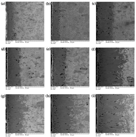 The OM images of the microstructure provided basic information about the zones identified in the borided X165CrV12 steel. They were used to measure the thickness of the outer FeB zone as well as the total layer thickness. Representative SEM images are shown in Figure 7. The layers, produced at 1123 K, were characterized by an average thickness from 12.45 to 38.53 µm with increasing processing time from 3 h to 9 h (Figure 7a–c). A further increase in the boriding temperature resulted in the formation of a layer with a thickness ranging from 33.03 to 66.96 µm, depending on the duration of the process (Figure 7d–f). The highest temperature of boriding (Figure 7g–i) ensured the highest thickness of layer, with 45.07, 59.62, and 78.76 µm produced at processing times of 3, 6, and 9 h, respectively.