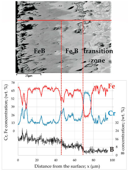 - In the transition zone, as a result of the accumulation of chromium atoms below the iron borides zone, high hardness (15.77 GPa) and Young’s modulus (332 GPa) were obtained in some areas. This was related to the presence of alloyed carbides in this region.