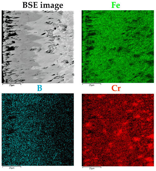 The preferential accumulation of chromium below the iron borides layer was confirmed by EDS mapping (Figure 10) of elements characteristic of borided high-chromium steel (Cr, Fe, B). It was clearly visible that in some areas at the interface between the Fe2B zone and the substrate material, the increased concentration of chromium was accompanied by a reduced iron concentration. The etching of the samples, used in the present study, was aimed at revealing of FeB and Fe2B zones of different colors, rather than revealing the structure of the substrate. Hence, it was difficult to observe the microstructure of the substrate material. However, X165CrV12 steel belongs to ledeburitic steels, i.e., after slow cooling after the boriding process, it has a structure consisting of fine pearlite, secondary carbides, and ledeburite—a transformed eutectic mixture—which includes fine pearlite, as well as primary and secondary carbides. It was assumed that in the areas below the Fe2B zone, such a microstructure occurred with high-chromium carbides.