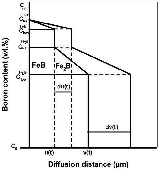 The variable u(t) designates the first time of the growing interface (FeB/Fe2B) and ν(t) represents the second interface (Fe2B/substrate). The solubility of boron atoms within the matrix was extremely low and had a value of 35·10−4 wt.% B) [30].