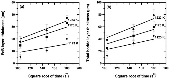 The experimental results were analyzed to kinetically describe the time variation of the thicknesses of the layers for a given process temperature. Therefore, plots showing the change in the thicknesses of the FeB and (FeB + Fe2B) layers versus the square root of time duration were obtained. Figure 12 describes the time dependence of the layers’ thicknesses at increasing process temperatures. The trend of the plotted straight lines demonstrated the parabolic characteristics for the growth kinetics of the borided layers. Table 3 groups the experimental parabolic constants derived from the slopes of the plotted straight lines in Figure 12 for the two growth fronts.