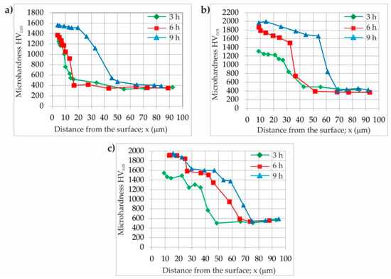 The Vickers microhardness profiles versus the distance from the surface are presented in Figure 14. For all of the analyzed samples, the highest hardness value was measured in the FeB and Fe2B zones. However, some differences were visible when comparing the profiles obtained at the same temperature and different boriding times. In general, the increase in boriding duration resulted in an increase in the hardness of the iron borides. This situation could be caused by the higher degree of substitution of the iron atoms in MeB and Me2B borides by chromium atoms. The boriding temperature had a similar effect on the hardness measured. In the case of high-carbon tool steel, the hardness of the borided layers depended mainly on the temperature and time of boriding, as well as on the alloying elements present in the substrate material. Despite the high content of carbon in X165CrV12 steel, this element had a negligible influence on the hardness of the borided layer due to the insolubility of carbon in the iron borides [8,41]. The decreased hardness was measured in the transition region below the iron borides layer (Figure 14). However, the presence of a high amount of alloyed carbides with high chromium content caused the increased hardness in this region compared to that in the substrate material.