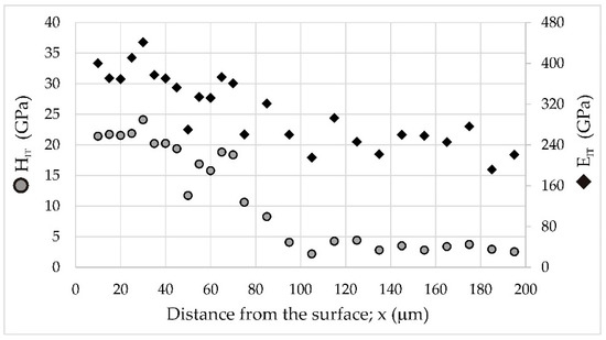 Indentation hardness (HIT) and indentation Young’s modulus (EIT) profiles of X165CrV12 steel after powder-pack boriding at the temperature of 1223 K for 9 h.