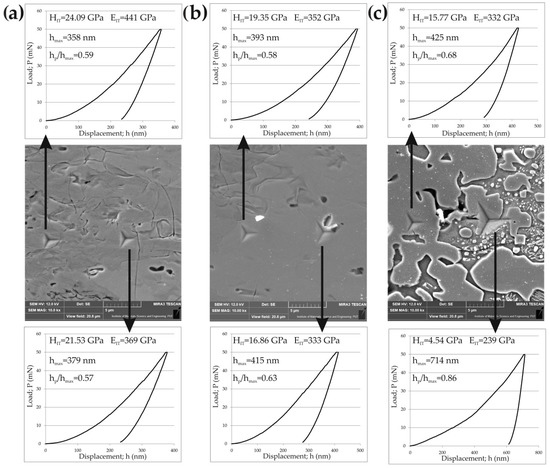 Figure 16 presents SEM images of borided X165CrV12 steel with visible Berkovich indents performed in the outer FeB zone (Figure 16a), inner Fe2B zone (Figure 16b), and the transition zone (Figure 16c). The smallest Berkovich indent dimensions were characteristic of the FeB zone (Figure 16a). However, in the area closer to the top surface, higher indentation hardness and indentation Young’s modulus were obtained, at 24.09 GPa and 441 GPa, respectively. The second indent performed in this zone had a lower HIT of 21.53 GPa, as well as a lower EIT of 369 GPa. These differences were a direct result of the chromium content measured in these areas (Figure 8). In the area in which the concentration of chromium was higher, and thus the amount of CrB borides was increased, higher values of nanomechanical properties were measured, including hardness (HIT), Young’s modulus (EIT), and maximum penetration depth (hmax). A similar tendency was observed in the case of the Berkovich indents performed in the Fe2B zone (Figure 16b). The nanomechanical properties measured in the transition zone strongly depended on the location of the indent (Figure 16c). The direct interface between the Fe2B needle tips and the substrate material was characterized by an increased chromium concentration (Figure 8). Therefore, the Berkovich indent performed in this region was characterized by a high hardness of 15.77 GPa and high Young’s modulus of 332 GPa. When the indent was made in the substrate with precipitates of alloyed carbides, the predominant influence of the matrix on the results was visible. The measured hardness and Young’s modulus were significantly lower, at 4.54 GPa and 239 GPa, respectively. Iron borides represent a group of phases with high hardness, high elastic modulus, and low maximum penetration depth, in contrast to the substrate with carbides. Comparing the shape of the load displacement curves, as well as the ratio of the permanent penetration depth hp to the maximum penetration depth hmax, it was found that both iron boride zones demonstrated more elastic behavior than the substrate with carbides.