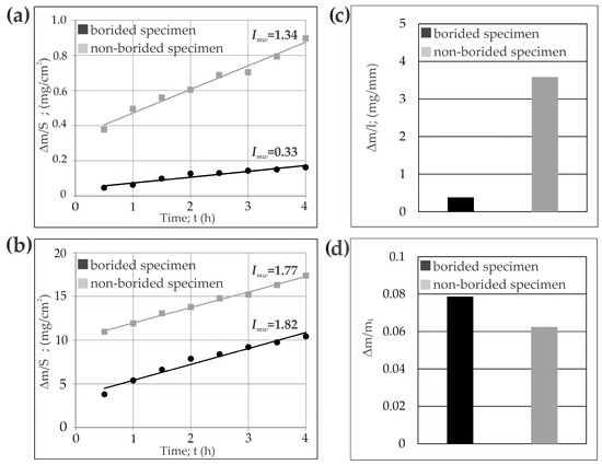 The mass wear intensity factor was defined as the mass loss (Δm) per friction surface (S) and unit of friction time (t). Its value corresponded to the slope of a straight line in the diagram of mass loss per friction surface (∆m/S) versus friction time (t). The values of Imw were calculated according to the equation: