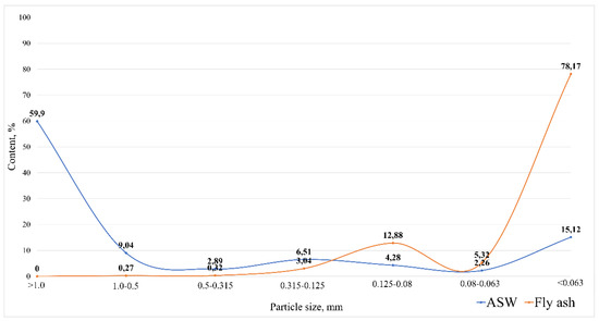 Sieve analysis was performed to determine the particle size distribution of the precursors and to identify the requirements for their subsequent processing. Since fuel slag is represented by vitreous pieces larger than 5 cm and its dimensions depend on the initial grinding, it was decided not to conduct studies to determine its fractional composition. Particle size distribution diagrams of ASM and fly ash are shown in Figure 2.