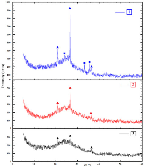 Results of X-ray analysis of coal energy waste: 1—ASM; 2—fly ash; 3—slag; Δ—high quartz (SiO2), □—hematite (Fe2O3).