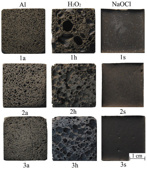 Spherical, dispersed aluminum (powder) of the ASD-1 grade with a purity of 99% and a specific surface area of 148 m2/g (GC Metal Energo Holding, Ekaterinburg, Russia), 30% hydrogen peroxide solution (LenReactive, St. Petersburg, Russia), and sodium hypochlorite of the A grade (LenReactive, St. Petersburg, Russia) were used as the foaming agents. Aluminum powder is a fine, highly dispersed silver-colored metal powder with a particle size of 10–30 µm, which, as a rule, contains a small amount of impurities such as copper, silicon, iron, and manganese. This type of powder is obtained by spraying molten aluminum. The aqueous solution of hydrogen peroxide is a colorless, odorless, heavy polar liquid. This is an inorganic substance, a compound of hydrogen and oxygen, the simplest representative of the class of peroxides. Due to hydrogen bonds, hydrogen peroxide molecules are strongly associated; therefore, hydrogen peroxide has higher values of density, viscosity, and boiling point (compared to water), which vary depending on its concentration. The sodium hypochlorite solution is a colorless liquid with a characteristic chlorine odor. Sodium hypochlorite is an inorganic sodium salt of hypochlorous acid, which is an unstable white crystalline substance, which is highly soluble in water (under normal conditions: 53.4 g per 100 g of water). Sodium hypochlorite is a large-scale product of the chemical industry obtained by brine electrolysis or by the chlorination of sodium hydroxide solutions.