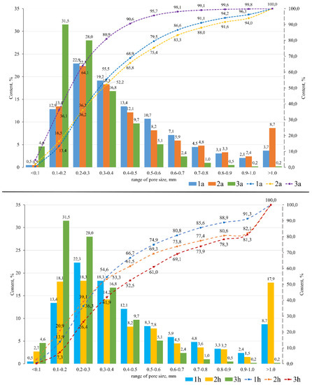Histograms and integral curves of pore size distribution ranges: 1a—fly ash + aluminum powder; 1h—fly ash + hydrogen peroxide; 2a—fuel slag + aluminum powder; 2h—fuel slag + hydrogen peroxide; 3a—ASM + aluminum powder; 3h—ASM + hydrogen peroxide.