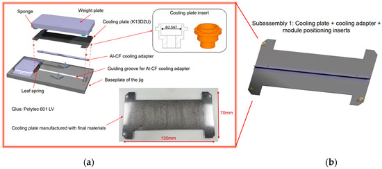 Supplied parts for investigation include subassemblies for the TBPS. (a) The details of the subassembly procedure are illustrated. The subassemblies consist of an Al/Cf cooling adapter glued on a carbon-fibre/cyanate ester composite cooling plate with aluminium inserts for module positioning. (b) Standalone cooling adapters have also been supplied, with and without coating.