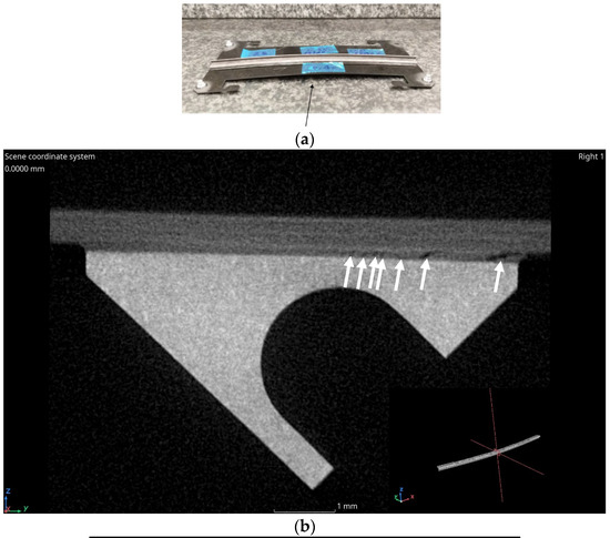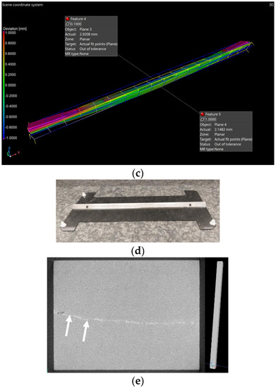 The reference sample (No.1) did not show any degradation of the geometry and remained within 70 µm of flatness. CT detected only some small voids in the adapter. Due to the exposure, sample No.10 developed a bending in the order of 300 µm; moreover, flaws are present in the glued interface. Sample No.25 developed the largest bending (2.9 mm) and the highest density of flaws in the glue volume, while sample No.7 (GPI adapter) shows casting imperfections (a centreline segregation band, typically observed in AlSi-based castings and pores that, as expected tend to be enclosed by the segregation band [20]) but remained substantially flat despite the same extreme conditions of storage applied to PM sample No.25 (Figure 4).