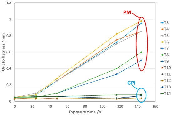 Evolution of the deformation in the function of time of subassemblies, including PM or GPI adapters, respectively. The subassemblies were exposed to 50 °C and 100% RH for increasing times up to 144 h. Their deformation was regularly measured during the exposure. The deformation reported in the y-axis represents the maximum measured sagitta for the respective times of exposure.