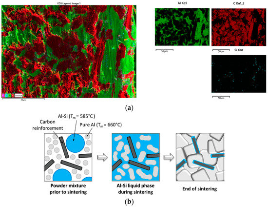 (a) EDS mapping was performed on a cross-section of a reference PM adapter, showing the distribution of Al, C and Si. (b) A Si-rich phase is expected due to the addition of eutectic Al11.3%Si powder in the sintering process (from [16]).