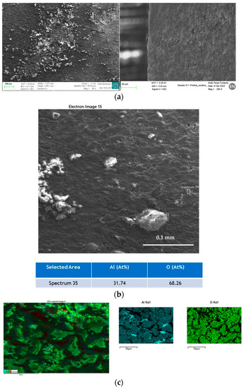 Observations of sample cross-sections were carried out in order to assess if there was any internal damage in the parts. SEM examination of a PM sample exposed to a temperature (70 °C) and humidity (RH = 100%) cycle for 60 h (Figure 9) showed a darker grey phase surrounding the Cfs that is present in a higher concentration towards the edges of the sample. The phase has a brittle appearance, with cracks originating close to the Cf boundary. EDS analysis of this phase (Figure 9b) shows a composition close to Al2O3 (Al 38.75 at.% and O 61.25 at.%), while the adjacent matrix is almost pure Al (98.24 at.%). Cavities are observed at the boundary between the Al and the Cf s. They are synonymous with an imperfect bonding of the fibres to the matrix. Moreover, in some positions, they are associated with corrosion residues due to the intake of moisture in case they have connectivity to the surface through the open channel of cavities along the fibres.