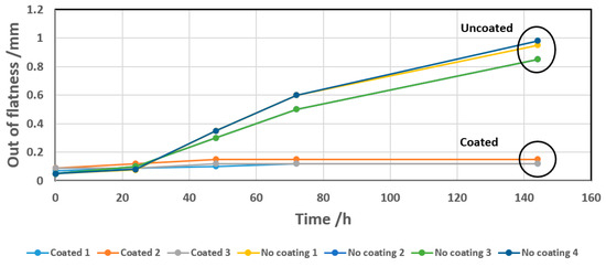 Subassemblies, including coated PM adapters (and uncoated for comparison) glued to Cf cooling plates, were then subjected to the same temperature-humidity cycle as depicted in Figure 5 (50 °C, 100% RH, exposure up to 144 h). The subassemblies, including coated adapters, have shown dimensional stability, while the ones with uncoated adapters develop out of flatness in the range of 0.8 mm to 1 mm at the end of the exposure (Figure 11).