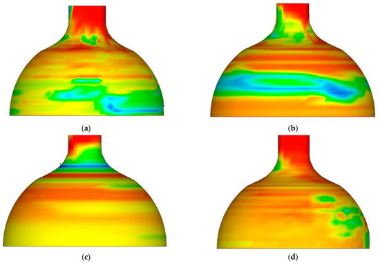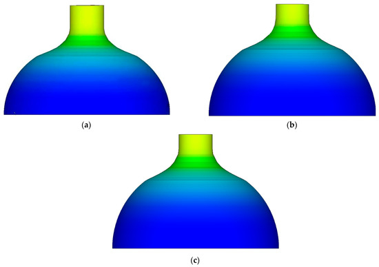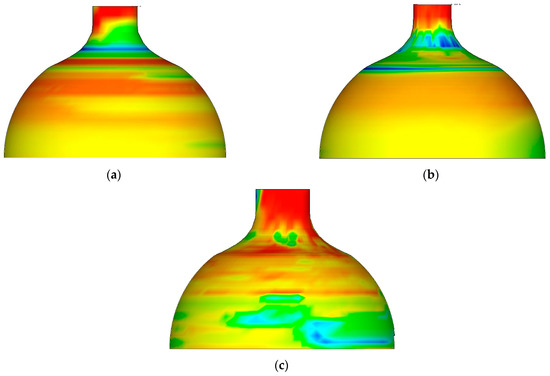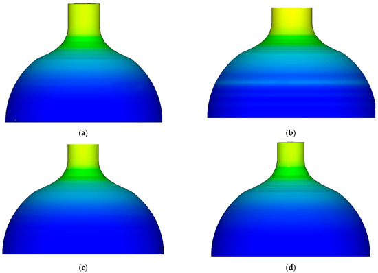 Table 2 shows the maximum and minimum wall thickness values of the high-pressure hydrogen storage bottle after spinning the inlet at different temperatures. It can be seen that with the increase in spinning temperature, the minimum wall thickness decreased, and the maximum wall thickness increased, i.e., the wall thickness at the starting point decreased, and the bottle shoulder became thick. This is mainly because the high-temperature conditions weakened the anti-deformation ability of the metal workpiece and improved its plasticity. The higher the temperature, the easier the metal flow, which results in an increase in the deformation. From the perspective of the influence of spinning temperature on wall thickness, it is helpful to optimize the spinning closing forming effect and the spinning temperature rise process by reducing the spinning temperature under the conditions of a hot deformation process, and the minimum and maximum back wall thicknesses should decrease and increase, respectively.
