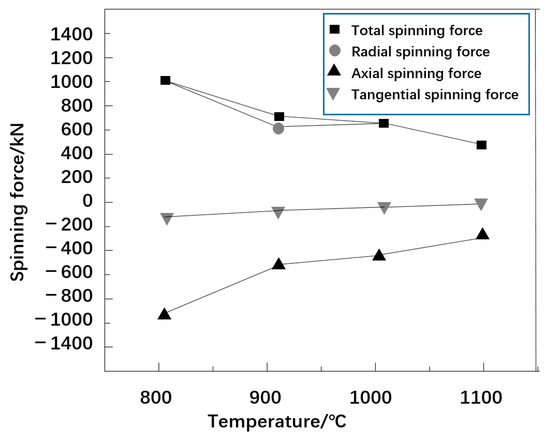 Figure 4 shows the variation in spinning pressure with spinning temperature. The total, radial, axial, and tangential spinning pressures decrease with the increase in temperature. However, the total spinning pressure and radial spinning pressure changed greatly, while the tangential spinning pressure changed smoothly. The higher the spinning temperature, the lower the spinning pressure. This is because the higher temperature decreases the deformation resistance of the billet metal and strengthens the plasticity, which facilitates the development of the deformation process. This also indicates that the implementation of a hot spinning process for high-pressure hydrogen storage cylinder closure can be effectively promoted by increasing the spinning process temperature, which is in line with the actual production situation.