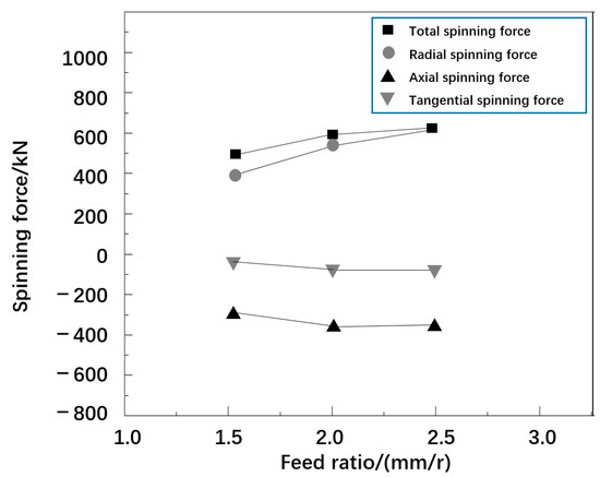 The curve of maximum spinning pressure with the increase in feed ratio is shown in Figure 7. The total rotational pressure increased from 588.2 kN to 754.3 kN, i.e., an increase of 166.1 kN; the radial rotational pressure increased from 531.0 kN to 785.3 kN, i.e., an increase of 197.1 kN; the axial spinning force increased from −423.1 kN to −478.6 kN, i.e., an increase of 55.5 kN; the tangential rotation pressure increased from −67.3 kN to −83.4 kN, i.e., an increase of 16.1 kN. It can be seen that with the increase in feed ratio, the total spinning pressure and three-way spinning pressure both show an increasing trend. The causes of the above phenomena were analyzed. The main reason is that in the stage of spinning operation, the track touched by both the rotating wheel and the billet was a single spiral line. In the stage of increasing feed ratio, the area where the spirals coincided with each other tended to decrease, and more metal billets changed in shape, which induced and promoted the increase in spinning pressure.