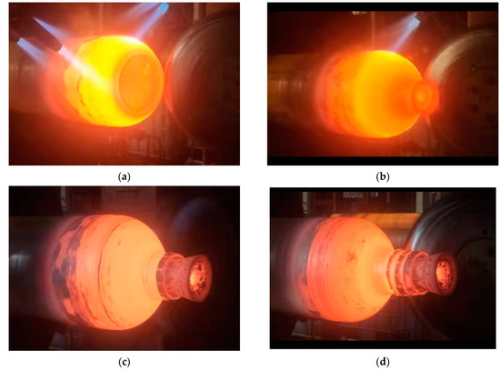 Based on the finite element simulation analysis, the optimized spinning parameters were obtained: the spinning temperature was 900 °C, the roller feed rate was 2 mm/s. Then, these parameters were used to verify the optimization results obtained using ABAQUS simulation, the high-pressure hydrogen storage cylinder was formed by using nine passes in the spinning process, and the cylinder spinning experiment process with good forming quality was conducted using the optimized process parameters as shown in Figure 8.
