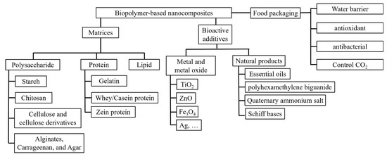In this review, the components of biopolymer-based nanocomposites and their applications for food packaging are summarized and discussed to show their great potential for active food packaging. The discussion of the components is separated into two parts: polymeric matrices, and additives with antimicrobial properties. Various polymers—such as polysaccharides (including starch, chitosan, and cellulose), proteins (including gelatin, whey, and zein), and lipids—are summarized to show their possibilities for the film matrices and related reinforcement strategies. Their antioxidant, water barrier, and oxygen barrier properties are also discussed in the following sections. After that, the metal and metal oxide nanoparticles, bioactive natural additives (e.g., essential oils, Schiff bases, polyphenols), and related antimicrobial mechanisms are discussed in the next section. Then, the discussion focuses on how to use gas releasers and absorbers in packaging systems to control carbon dioxide (as shown in Figure 1). Finally, insight into the emerging practical active food packaging systems is provided.