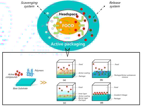 The concept of active food packaging has been developed to overcome these two problems. Early forms of antioxidant packaging were in the format of sachets, pads, or labels. However, many chemicals in these systems are not edible, and if the pads or sachets carrying the chemicals are damaged, it may cause safety concerns. Thus, this problem might be prevented by applying safe and active packaging materials. This kind of packaging can be categorized into two forms based on antioxidant activity (Figure 2): The first form is the oxygen scavenging system, using materials such as iron or ferrous oxide. The second is the release system, in which antioxidants are released into food and eliminate free radicals [63,66]. Antioxidant compounds used in active packaging can be synthetic—such as butylated hydroxyanisole (BHA)—or natural, such as essential oils [63,65,67]. In recent years, many studies have been conducted on active packaging materials with antioxidants incorporated in the polymer matrix or on their surface [64,67,68].