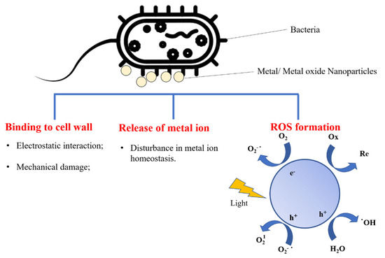 Molecular mechanisms of antibacterial activity of metal/metal oxide nanoparticles (ROS: reactive oxygen species).