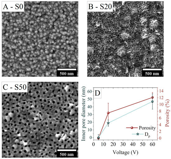 The morphology of anodized titanium oxide obtained at (A) 5 V, (B) 15 V, and (C) 60 V. The voltage impact on the inner pore diameter and the porosity is shown in (D).