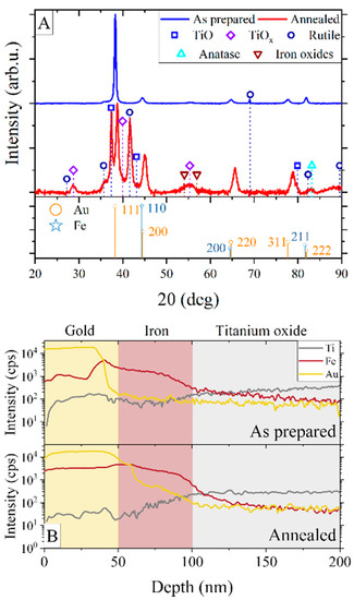 The diffractogram of the annealed sample shows the change in the crystal structure of the oxide, confirmed by the appearance of diffraction peaks from various titanium oxides. The most intense diffraction maxima at 37.4° and 41.6° come from TiO and rutile [38], respectively. Both of them are related to the (111) crystallographic plane. The scarce amount of oxygen during the preparation process is responsible for the appearance of non-stoichiometric titanium oxide exhibiting diffraction peaks at 20.9°, 28.7°, 39.9°, and 55° [39,40]. The presence of titanium oxides with a low Ti oxidation state is a consequence of the lack of oxygen during annealing and the usage of electrolytes without water. Additionally, the oxygen atoms can diffuse through the ATiO/Fe interface and form iron oxides, the presence of which is suggested by the diffraction maximum found near 55°. However, the presence of iron oxide cannot be clearly identified since the diffraction peaks overlap with peaks coming from titanium oxide. Another effect caused by annealing is a shift of XRD peaks from gold to higher angles, caused by the shortening of the lattice parameter a from 4.07 (2) Å to 4.01 (2) Å. The compression is a consequence of the gold layer intermixing with iron atoms [41], noticeable on SNMS depth profiles (Figure 2B). The decrease of lattice parameters of gold results from the placing of the Fe atoms in the Au lattice. The iron atoms have a smaller atomic radius (124.1 pm) compared to gold atoms (144.2 pm), causing the decrease of the lattice plane distance of Au (111) [42]. While the as-prepared sample displays a sharp step between gold and iron layers, in the annealed sample, the iron atoms are mixed evenly within the gold layer. There is no evident acute step on the depth profile, but rather a smooth passage between Au and Fe layers with gold concentration decreasing inside the iron layer. On the other hand, the lack of a sharp step between Fe and ATiO in both the as-prepared and annealed samples is due to the porous structure of titanium oxide. The deposited iron partially penetrates the pores and shows a smooth transition in SNMS analysis for both Fe and Ti atoms.