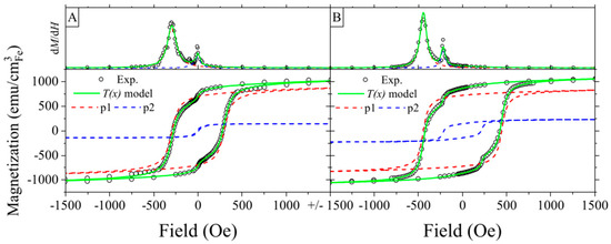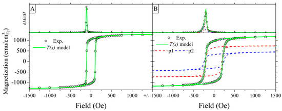 The magnetic hysteresis loops of the as-prepared and annealed S0 samples are presented in Figure 3A,B, respectively. Upper parts of the graphs show the first derivative of dM(H)/dH. In the case of the as-prepared sample, a single narrow peak with a maximum at 110 Oe is noticeable, while after annealing, an asymmetric peak is present, indicating a more complicated magnetic system. To deconvolute the magnetic signal, we adopted the modified Takács model T(x) [35,43]. The T(x) expression for the symmetric hysteresis loops with n ferromagnetic components is presented below: