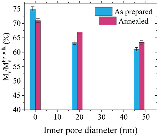 After annealing, the saturation magnetization shows an almost linear decrease with increasing inner pore diameters. We can assume that the passivation of the iron layer leads to a similar thickness of iron oxide in each sample; however, the volume of FeO is larger for wider pores due to the larger contact area between ATiO and Fe. As a result, the wider the pores, the smaller the resulting saturation magnetization. We found similar linear behavior for the effective anisotropy constant, where a decrease of Keff was present with an increasing size of the pores reflecting the influence of the non-planar morphology of the substrate (see Figure S4 in Supplementary Materials). The annealed nanoporous samples exhibit a rise of Ms when compared to the as-prepared systems, which is caused by the increase of crystallinity degree and the size of iron crystallites (in agreement with [47]) two times larger after heat treatment.