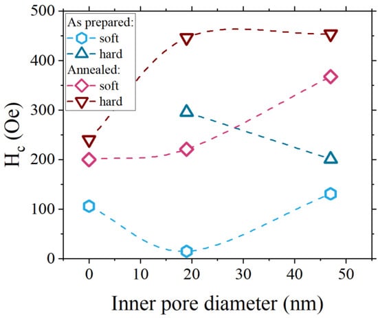 The evolution of coercive fields determined from the T(x) model, with respect to the inner pore diameter, is shown in Figure 6. The as-prepared sample S0 exhibits a value of Hc equal to 106(10) Oe, comparable to the Hc values for polycrystalline iron films with a similar thickness (about 50 nm) [48,49]. Annealing of the sample doubles the value of total coercivity and causes the appearance of the second magnetic phase. Structural defects, such as grain boundaries, together with surface roughness and misalignment of the magnetization axis between grains, have the largest impact on coercivity in polycrystalline films [50,51]. Heat treatment induces recrystallization, leading to the improvement of crystal structure and the decay of structural defects, hence, the coercivity should be smaller. However, the formation of iron oxide at the interface between ATiO and Fe leads to the appearance of a second, softer magnetic phase and an increase in coercivity. The rise of the coercive field is a result of inter-granular exchange hardening between hard and soft magnetic phases, as observed in the literature [52,53]. The heat treatment of the sample leads to the increase of iron oxide and, consequently, to an increase of contact area between the oxide and iron layer. This means more active sites for the intergranular exchange harden due to the increase of pinning sites and the roughness of the interface. In the case of patterned samples, the magnetic two-phase composition exists even before heat treatment. The values of the coercive field for S20 and S50 samples are higher than for the mesoporous specimen. This effect results from the pinning of magnetic domain walls at pores acting as artificial defects [54].