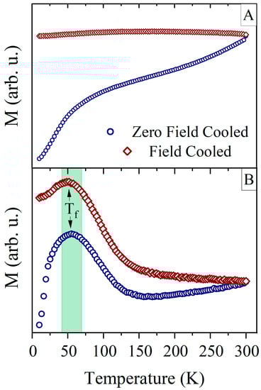 To investigate the essential magnetic properties of nanoporous samples, we carried out the temperature dependent zero-field cooled and field cooled magnetization measurements. The ZFC and FC magnetization curves for sample S20 are shown in Figure 8. The ZFC-FC curves for the as-prepared sample demonstrate the dependence of ferromagnet below the Curie temperature of unsaturated magnetic moments. On the contrary, the curves for the annealed sample present well-defined maxima near 50 K, labelled as freezing temperature Tf on both MZFC and MFC curves. The presence of the maxima is related to the appearance of iron oxides at the ATiO/Fe interface and the collective freezing of their magnetic moments [63], while at high temperatures, a ferromagnetic signal from the Fe layer dominates.