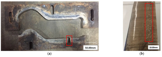 In the analysis of the obtained results for the lower tool made of steel Hardox 600 (Figure 5a), we can state that the material loss is practically uniform on the whole forming line, yet greater on the input side, i.e., the nozzle. In turn, for the bit made from steel NC11LV (Figure 5b), the wear is lower, and the biggest material loss is in the areas of intensive abrasive wear, that is, in the areas responsible for the shaping of the so-called wave. In this zone, the wear reaches over 2 mm. In the remaining section of the bit, the highest wear is still visible on the edge, yet it oscillates between 1.5 mm to almost 2 mm. For the tools made from steel Hardox, the wear mechanism of the bit is similar but much more intensive. The biggest material loss takes place on the whole length of the edge on the side of the pug mill and, practically on the whole length of this edge, the wear reaches over 2 mm, with the maximum of 2.5 mm on the tip of the edge.