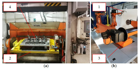 An example of technological synergy in the design of technological processes based on the fourth industrial revolution is the design of an automated production line (in the analyzed case—a welding cell—Figure 2 and Figure 3) producing a steel structure. The presented production line (item 1, Figure 5), with a high degree of automation, should additionally have full synergy with the palletizing robot (item 2, Figure 5), which should be installed at the end of a technological line in order to pick up the manufactured elements and place them on pallets according to the given algorithms. After the robot completes the palletization, an automatic self-propelled trolley (item 3), which transports the manufactured elements to the warehouse (item 4, Figure 5), will be called. After delivering the items to the designated storage area (selected rack), the self-propelled trolley sends a signal to the storage rack that it is at the designated location. Subsequently, when the empty rack receives a given signal, it goes to the designated place and sends the information to the manipulator located on the platform in the warehouse zone that it is ready to load the semi-finished products brought by the trolley [39,40,41,42,43]. When the robot receives a signal from the rack, it will move on the platform to the designated place and start the process of reloading from the self-propelled trolley to the rack. After the reloading process is completed, the manipulator on the platform will move away from the rack and give a signal that the operation is completed. Then, the rack will return to its initial position with the “loaded” status, and the self-propelled trolley will start another cycle of collecting the finished products from the welding cell while the unloading manipulator will wait for the next tasks (Figure 5).