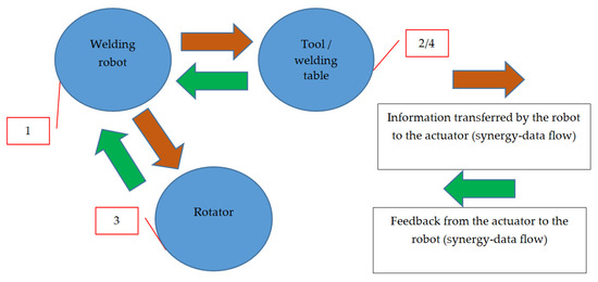 The diagram of the operation of the discussed system, shown in Figure 2 and Figure 3, together with a demonstration of the elements that work in synergy during the welding process, is shown in Figure 4. The presented drawing (Figure 4) shows the way of information flow between the robot (item 1) and the execution elements, i.e., the rotator (item 3) and the welding table (item 2) on which the turntable (item 4) is mounted.