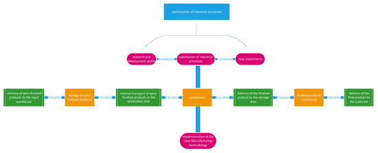The optimization of production and technological processes leads to the creation of certain mathematical models, the components of which, i.e., sets of feasible solutions and optimization criteria, should reflect the leading concepts shaping the company’s policy. Optimization depends on the existence of a set of alternatives and can be associated with many elements of a production process (Figure 6). The implemented optimization must also take into account synergism, technology coherence and standardization at every stage of their implementation. Figure 6 shows an outline of a technological process and its successive elements, each other as well as the correlation of research and development with the automation of industrial processes and planning new investments, which, when combined with the simultaneous implementation of the Lean Manufacturing system, will result in optimization in the production area.